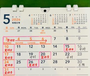 5月の定休日とスタイリストお休みのお知らせ 2026/04/24 info いつもAnouKをご愛顧いただきありがとうございます。 5月のスケジュールです。 名前が記入されている所はスタイリストがお休みとなります。 よろしくお願いいたします。 4月の定休日とスタイリストお休みのお知らせ